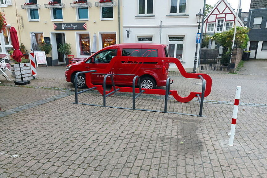 „Bezüglich der Art des Fahrradständers am südlichen Rand des Ziepchesplatzes kann man sicherlich unterschiedlicher Meinung sein“ da der Hersteller Ständer mit einem grünen Fahrradsymbol statt einem roten Autosymbol anbietet. Wichtig und begrüßenswert ist vor Allem, dass hier Abstellplätze geschaffen worden sind. Das betrifft auch die vier neu installierten Abstell-Nadeln auf der Nordseite des Ziepchesplatzes, die in unmittelbarer Nähe zum Bücherschrank liegen.