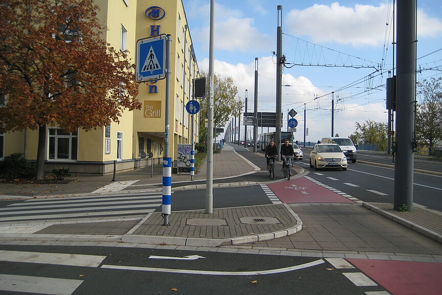 - durchgehend rote Einfärbung der Radverkehrsanlagen, um somit eine eindeutige, nachvollziehbare Führung sicherzustellen. Insbesondere sollten die Furten rot eingefärbt und angehoben werden…".
