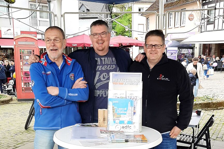 Am Infostand ergaben sich außerdem zahlreiche Gespräche mit Interessierten, u.a. mit dem Landtagsabgeordneten Björn Franken über aktuelle Fragen und Probleme rund ums Radfahren an der Oberen Sieg. Auch Bürgermeister Viehof schaute beim ADFC vorbei.
